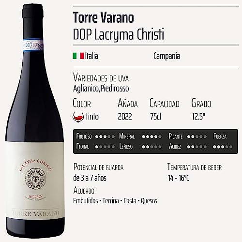 Descubre el Lacryma Christi tinto 2022 – Torre Varano, una joya de la denominación de origen protegida (DOP) de Campania, Italia. Este vino tinto, elaborado a partir de las variedades de uva Aglianico y Piedirosso, ofrece una experiencia sensorial única que cautivará a los amantes del vino. Ideal para acompañar tus cenas especiales o disfrutar en una velada tranquila, este pack de 6 botellas de 75 cl es perfecto tanto para ocasiones festivas como para regalar a un aficionado del mundo vitivinícola.