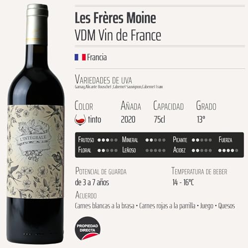Descubre L’intégrale tinto 2020 de Les Frères Moine, un exquisito vino de mesa francés que combina la esencia de tres variedades de uva excepcionales: Gamay, Alicante Bouschet y Cabernet Sauvignon. Este vino es perfecto para los amantes del vino que buscan una experiencia única y accesible. Ideal para acompañar tus comidas o disfrutar en una reunión con amigos, L’intégrale tinto ofrece un sabor equilibrado y una complejidad que cautiva a cualquier paladar.
