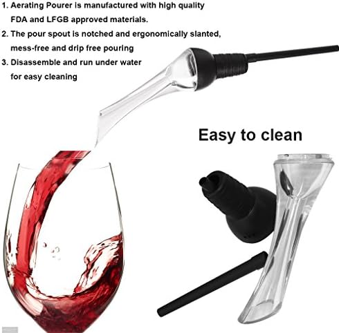 ❤ MATERIALES APROBADOS POR LA FDA Y DISEÑO ELEGANTE: El aireador con efecto de aire tiene una apariencia elegante, que mejora su experiencia de bebida. El aireador de aire para vino está hecho de materiales aprobados por la FDA de alta calidad, se puede desarmar y enjuagar con agua corriente para una limpieza sin esfuerzo después de usar.