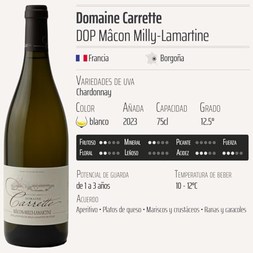 Descubre el exquisito Mâcon Milly-Lamartine blanco 2023 del Domaine Carrette, un vino de Denominación de Origen Protegida (DOP) de la prestigiosa región de Borgoña, Francia. Este vino blanco, elaborado exclusivamente con la variedad de uva Chardonnay, ofrece una experiencia sensorial única que cautivará a los amantes del vino y será el complemento perfecto para tus comidas. Su versatilidad lo convierte en la elección ideal tanto para ocasiones especiales como para el disfrute diario.