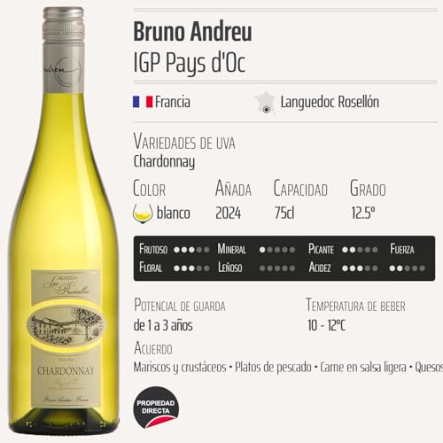 Descubre el fascinante Pays d’Oc Maison Les Prunelles Chardonnay blanco 2024 de Bruno Andreu, un vino con la Denominación de Origen IGP Languedoc Rosellón que promete llevar tu experiencia vinícola a nuevas alturas. Este Chardonnay, elaborado en la soleada región del sur de Francia, es perfecto para los amantes del vino que buscan un blanco fresco y aromático. Ideal para maridar con mariscos, ensaladas o simplemente disfrutar solo, su elegante sabor hace de este vino una elección versátil para cualquier ocasión.