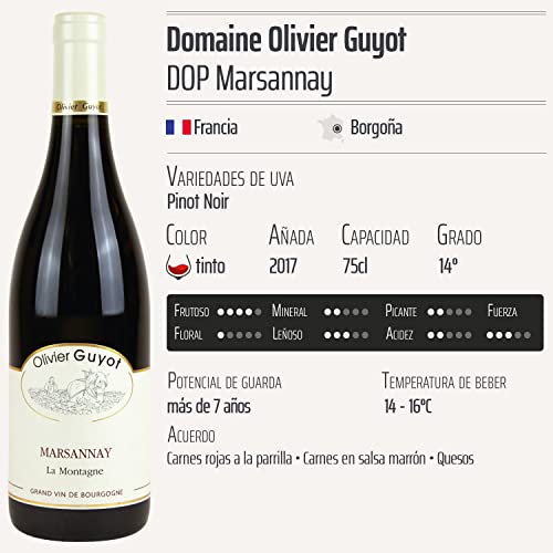 Descubre el Marsannay La Montagne tinto 2017 de Domaine Olivier Guyot, un vino DOP de Borgoña, Francia, que te transportará a la esencia misma de esta reconocida región vitivinícola. Con su refinada variedad de uva Pinot Noir, este vino es ideal para los amantes de los tintos elegantes y complejos, perfectos para acompañar cenas especiales o disfrutar en momentos de celebración. Su calidad excepcional lo convierte en una elección preferida tanto para entusiastas del vino como para coleccionistas que buscan un toque distintivo en su bodega.