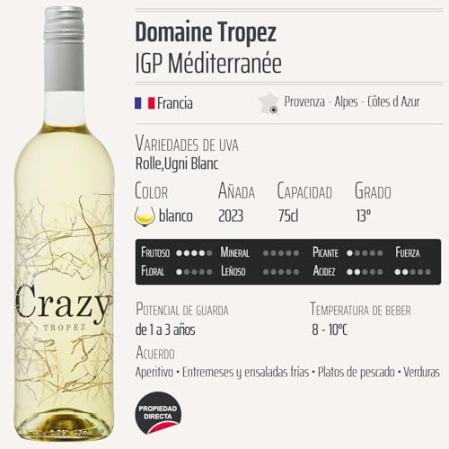 Méditerranée Crazy Tropez blanco 2023 destaca por su mezcla cautivadora de variedades de uva Rolle y Ugni Blanc. Su perfil aromático es un deleite, con notas de frutas cítricas, flores blancas y un fondo mineral que lo hace refrescante y ligero. La vinificación cuidadosa asegura que cada botella preserve la esencia del terruño provenzal, ofreciendo un vino equilibrado con una acidez brillante que lo hace ideal para los días cálidos. Además, su presentación en estuches de 12 botellas de 75cl es perfecta para quienes deseen abastecerse para eventos o compartir con amigos.