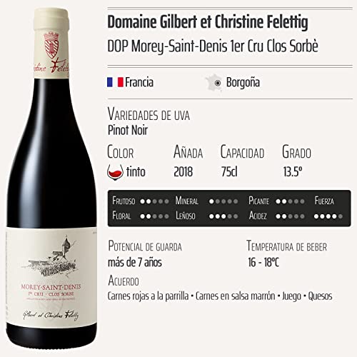 Descubre el exquisito Morey-Saint-Denis 1er Cru Clos Sorbè tinto 2018, de Domaine Gilbert et Christine Felettig, una joya de la DOP Borgoña, Francia. Este vino, elaborado con las mejores uvas Pinot Noir, es perfecto para los amantes del vino que buscan una experiencia sensorial única. Con su elegancia y complejidad, se convierte en la elección ideal para celebraciones especiales o cenas gourmet, deleitando a los paladares más exigentes.
