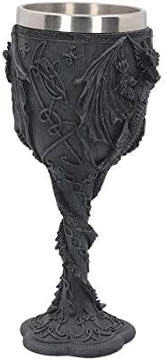 Este producto es para uso ornamental. La bestia de color negro se aferra al lado del cáliz, sus ojos penetrantes mirando hacia adelante. Detrás del dragón, la base está cubierta con un patrón de espiral celta ornamentado. Bajando por el tallo, la cola de los dragones gira. Fundido en la resina más fina antes de ser cuidadosamente pintado a mano, este cáliz es perfecto para cualquier persona que tenga una pasión por las bestias míticas.