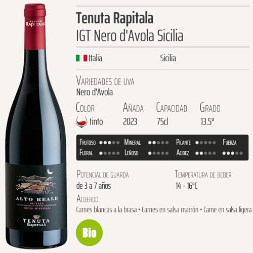Descubre el Nero d’Avola Sicilia Alto Reale tinto 2023, un vino orgánico de Tenuta Rapitala que representa la esencia de la viticultura siciliana. Este vino tinto, elaborado únicamente con la variedad de uva Nero d’Avola, ofrece un sabor auténtico y una calidad superior. Ideal para amantes del vino que buscan una experiencia única y sostenible, este producto destaca por su carácter intenso y su compromiso con el medio ambiente. Perfecto para disfrutar en una cena especial o para regalar a un aficionado del vino.