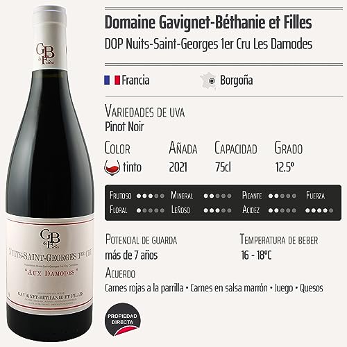 El Nuits-Saint-Georges 1er Cru Les Damodes destaca por su excepcional calidad y características únicas. Proviene de una de las zonas más prestigiosas de Borgoña, donde las condiciones climáticas y geográficas favorecen el cultivo de la uva Pinot Noir. Este vino presenta un profundo color rubí y una intensa nariz que evoca aromas a frutas rojas, especias finas y notas terrosas que se desarrollan con el tiempo. En boca, su textura es sedosa y equilibrada, con un final largo y persistente que deja una huella memorable.