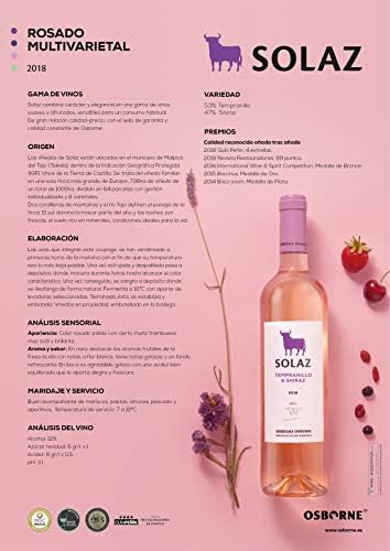 Solaz combina carácter y elegancia en una gama de vinos suaves y afrutados, versátiles para un consumo habitual. De gran relación calidad-precio, con el sello de garantía y calidad constante de Osborne.