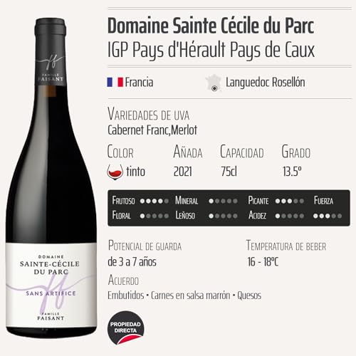 Descubre el Pays d’Hérault Pays de Caux Sans artifice tinto 2021, una joya del Domaine Sainte Cécile du Parc que representa la esencia del Languedoc Rosellón en Francia. Este vino IGP es perfecto para los amantes del vino tinto que buscan una experiencia auténtica y natural, sin artificios. Elaborado con las variedades de uva Cabernet Franc y Merlot, este vino es ideal para aquellos que desean disfrutar de una bebida versátil que complemente desde una cena elegante hasta una reunión informal.