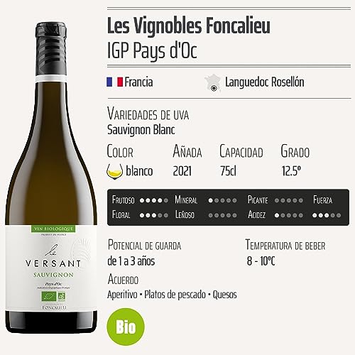 Descubre el Pays d’Oc Le Versant Sauvignon blanco 2021, un vino que destaca por su origen orgánico y su calidad excepcional. Elaborado por Les Vignobles Foncalieu bajo la Indicación Geográfica Protegida (IGP) de Languedoc Rosellón, Francia, este Sauvignon Blanc es ideal para amantes del vino fresco y afrutado, perfecto para acompañar una amplia variedad de platos o disfrutar solo en una cálida tarde. Con presentaciones de 12 botellas de 75cl, es una opción conveniente para quienes buscan calidad y sostenibilidad en cada sorbo.