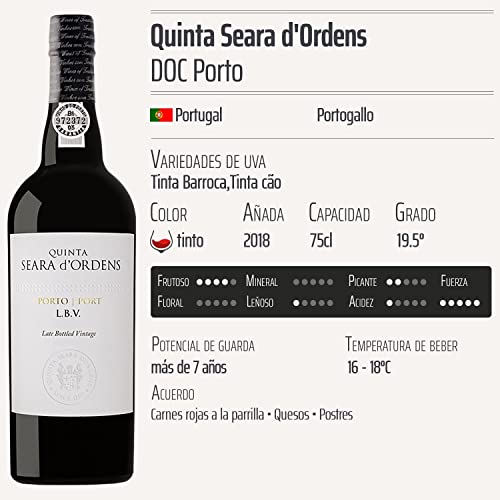 Descubre el Porto Late Bottled Vintage tinto 2018 de Quinta Seara d’Ordens, un vino excepcional de la prestigiosa Denominación de Origen Controlada (DOC) de Portugal. Este vino se elabora a partir de las selectas variedades de uva Tinta Barroca y Tinta Cão. Su sabor robusto y complejo lo convierten en una elección perfecta para los amantes del vino que buscan una experiencia auténtica y memorable. Ideal para maridar con platos contundentes o disfrutarlo solo, este Porto es perfecto tanto para connoisseurs como para aquellos que se inician en el fascinante mundo del vino.