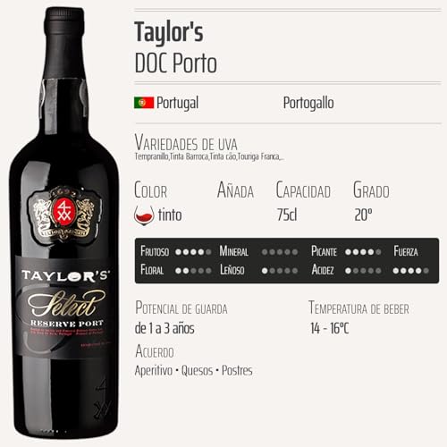 Descubre el Porto Select Tinto de Taylor’s, un vino de calidad superior con Denominación de Origen Controlada (DOC) de Portugal. Este exquisito vino tinto, elaborado con una cuidadosa selección de variedades de uva como Tempranillo, Tinta Barroca y Tinta Cão, es perfecto para los amantes del vino que buscan una experiencia de sabor auténtica y envolvente. Ideal para acompañar comidas especiales o disfrutar en momentos de celebración, el Porto Select Tinto es una elección recomendada tanto para connoisseurs como para quienes desean explorar el mundo del vino de Oporto.