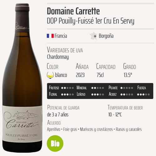 Descubre el exquisito Pouilly-Fuissé 1er Cru En Servy blanco 2023, un vino orgánico de prestigio proveniente del Domaine Carrette, ubicado en la renombrada región de Borgoña, Francia. Este vino, elaborado con la variedad de uva Chardonnay, es ideal para amantes del vino que buscan una experiencia de degustación única y auténtica. Su característico equilibrio entre frescura y complejidad lo convierte en la opción perfecta para celebraciones, cenas elegantes o simplemente disfrutar en buena compañía.