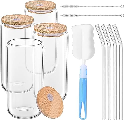 Tazas de Cafe, Revivoer Juego de 4 Vasos de Cristal con Reutilizable Tapa de Bambú y Pajitas de Vidrio – Perfectos para Preparar Bebidas Frías Como Iced Coffee, Sodas, Cócteles e Cervezas