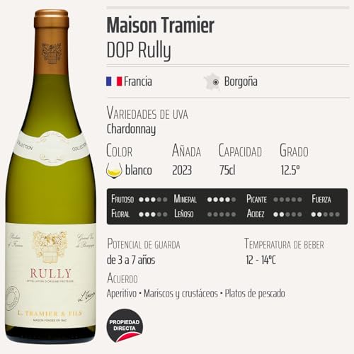 El Rully blanco 2023 destaca por su frescura y complejidad, ofreciendo un perfil aromático que combina notas de frutas blancas, flores y un toque sutil de mineralidad. La crianza en barricas de roble aporta una ligera cremosidad en boca, realzando la estructura del vino. Su acidez equilibrada y su final largo lo convierten en un acompañante ideal para mariscos, pescados y platos con salsas suaves. La filosofía de Maison Tramier, enfocada en la producción sostenible y respetuosa con el medio ambiente, añade un valor adicional a este magnífico vino.