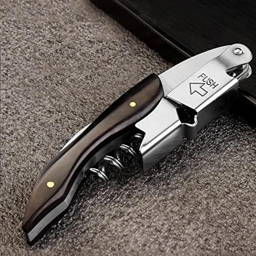PALANCA ADICIONAL DE 2 ETAPAS: Este abridor de vino es una herramienta ideal. Es un mecanismo de palanca de dos fases, proporciona palanca adicional y hace que tirar sea más fácil. Incluso el corcho más largo, se puede abrir fácilmente con la bisagra doble, por lo que es mejor que el sacacorchos de una bisagra convencional. Puedes quitar los corchos de vino en segundos.