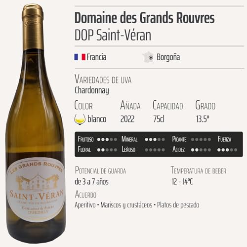 Descubre el Saint-Véran blanco 2022 del Domaine des Grands Rouvres, un vino que destaca por su calidad excepcional y su origen en la reconocida DOP (Denominación de Origen Protegida) de Borgoña, Francia. Este vino, elaborado 100% con uvas Chardonnay, es una elección perfecta para los amantes del buen vino que buscan una experiencia única en cada sorbo. Ideal para acompañar mariscos, pescados o simplemente disfrutar en una ocasión especial, este pack de 12 botellas de 75 cl ofrece una oportunidad inmejorable para disfrutar de la elegancia y frescura que caracteriza a los grandes vinos de la Borgoña.