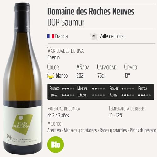 Descubre el Saumur Clos Romans blanco 2021, un vino orgánico del aclamado Domaine des Roches Neuves, proveniente de la Denominación de Origen Protegida (DOP) del Valle del Loira en Francia. Elaborado a partir de la variedad de uva Chenin, este vino ofrece un viaje sensorial inigualable y está dirigido a los amantes del vino natural y de calidad, así como a aquellos que buscan una experiencia auténtica y sostenible en cada sorbo.