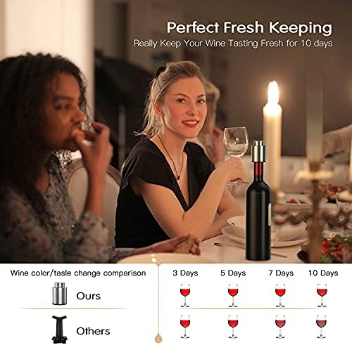 ????MAYOR TIEMPO DE ALMACENAMIENTO–La función de vacío puede retener el sabor del vino, lo que hace que el tiempo de degustación sea superior a una semana. La función 100% a prueba de fugas facilita el transporte de vino sin usar durante los picnics o viajes, y reduce el desperdicio.